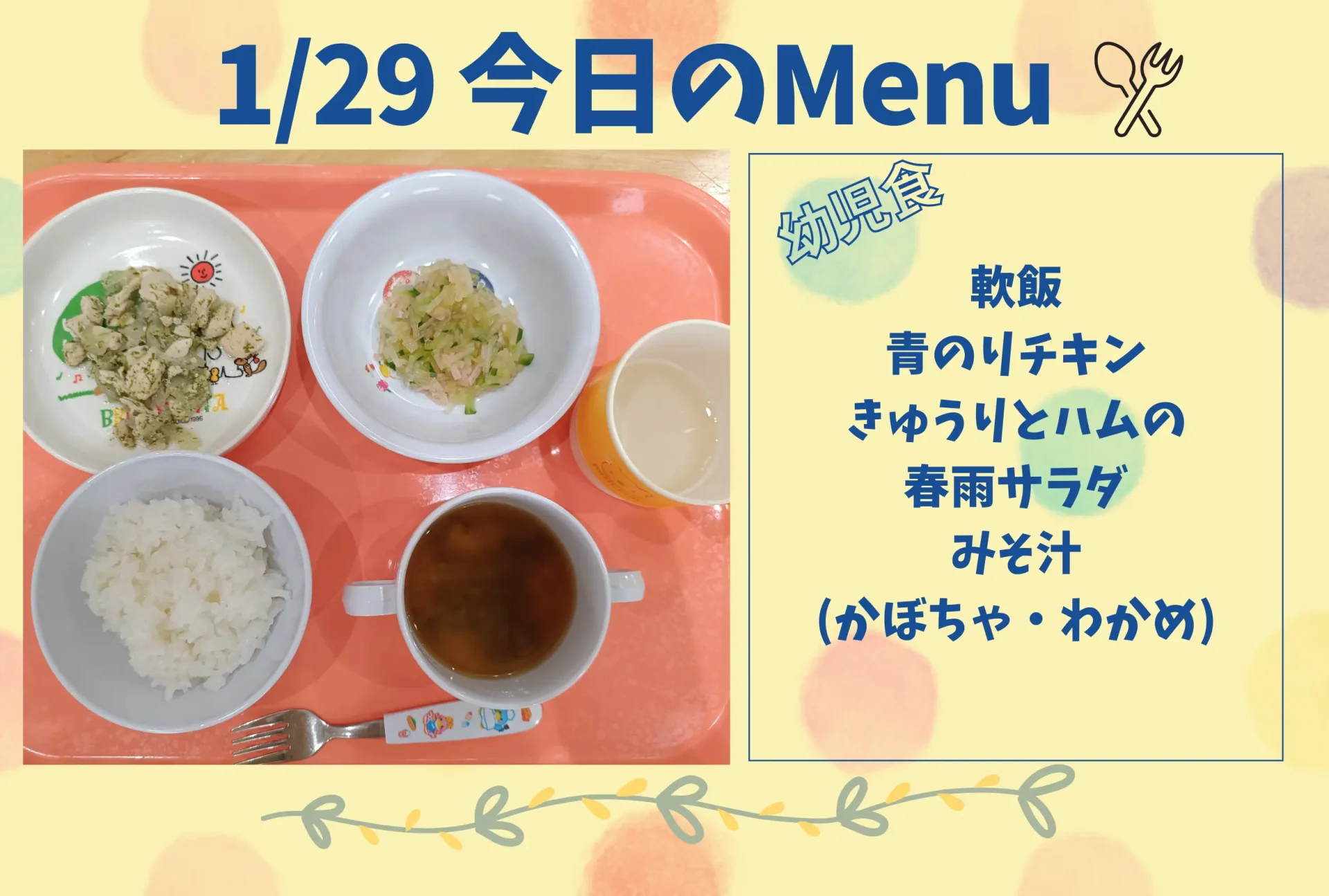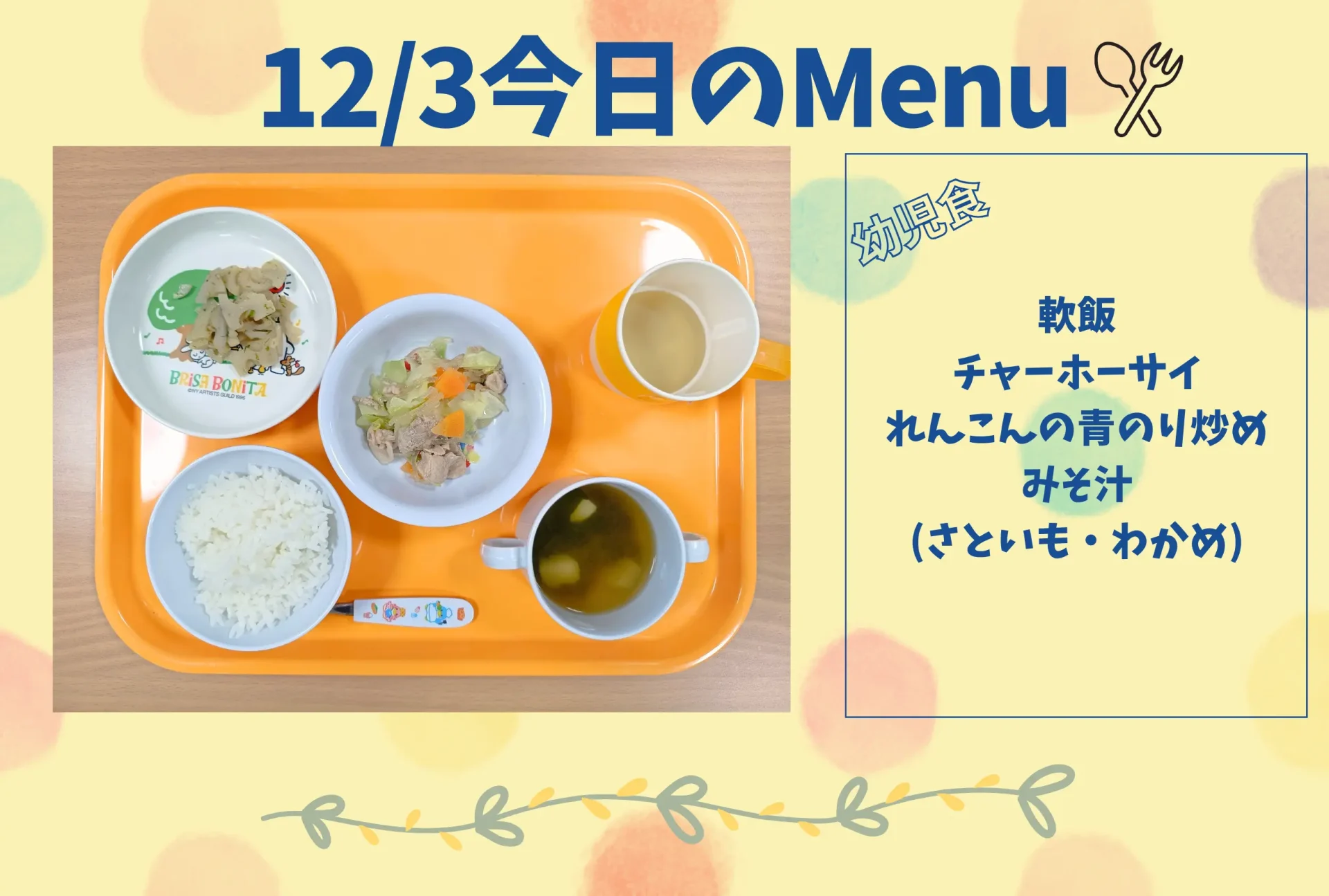 ○ 「安全で安心な食材を使用すること」を第一に考え、有機野菜や無添加食品の食材を使用。また、専属の外部管理栄養士が作成した献立システムを採用し、自園調理を行い温かい給食やおやつを提供しております。