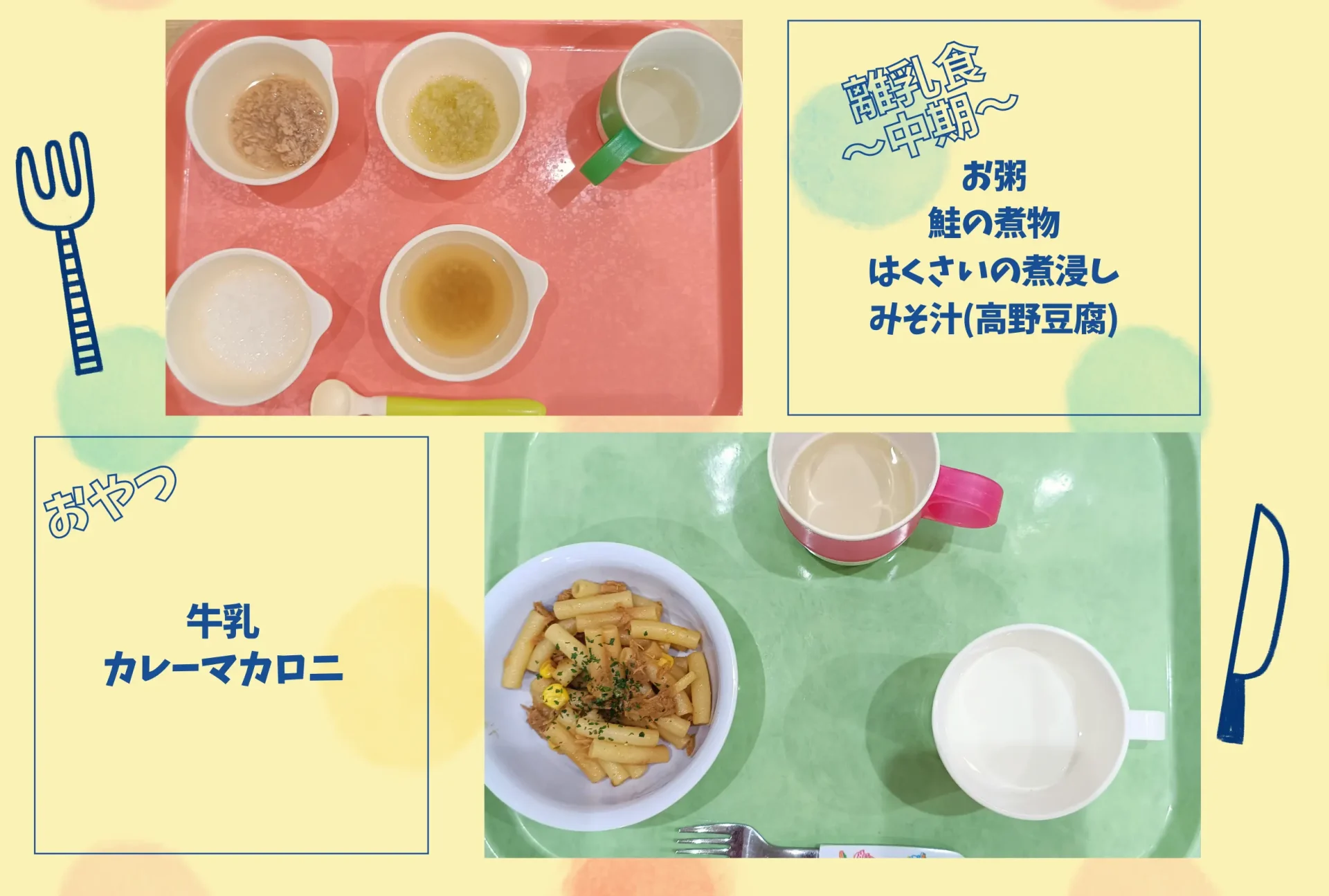 パクパク期大人と同じようなメニューを薄味で柔らかくしたものを提供しています!
